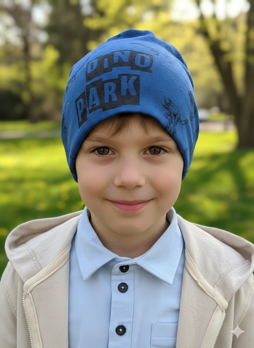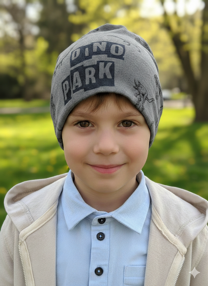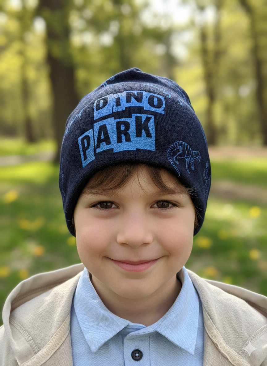 Chlapčenská prechodná čiapka s nápisom Dino Park a motívom dinosaurov.