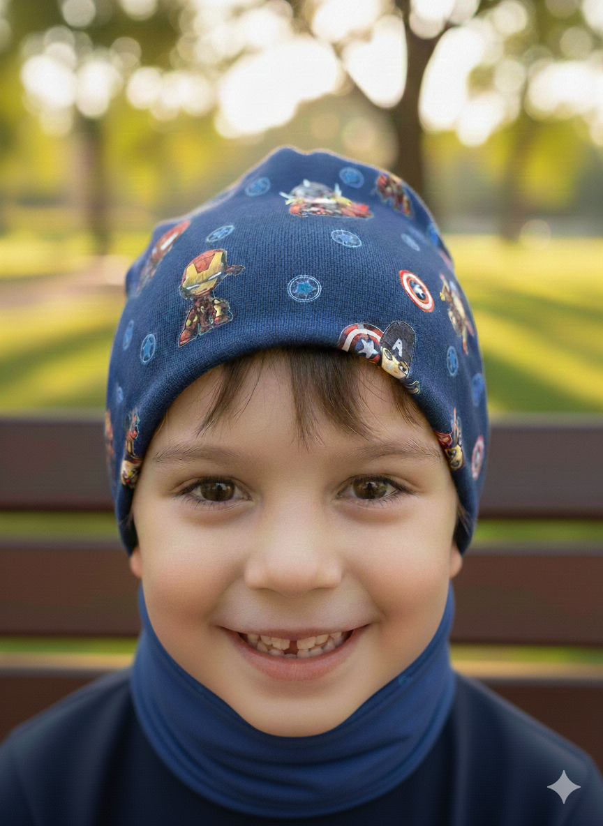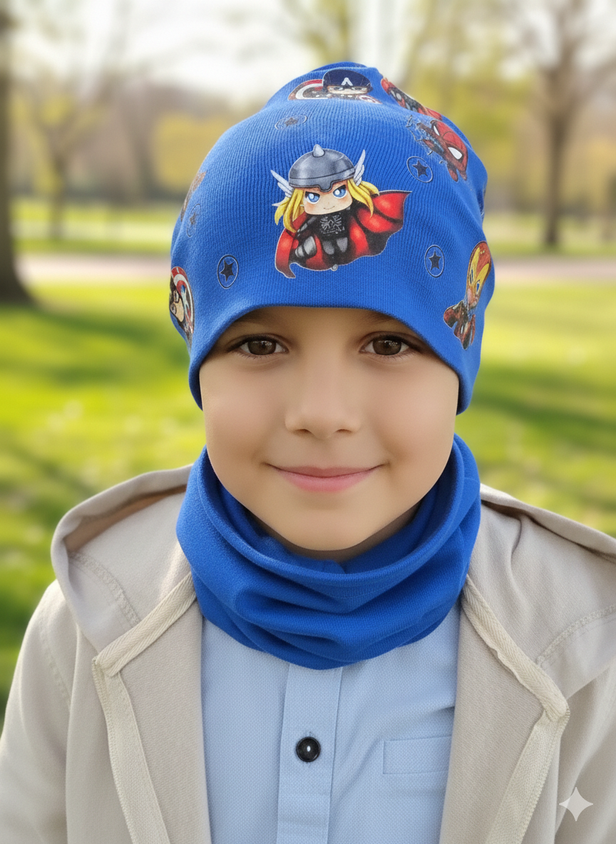 Chlapčenský prechodný set čiapka s nákrčníkom s potlačou Avengerov. Sedí na veľkosť 50-54.