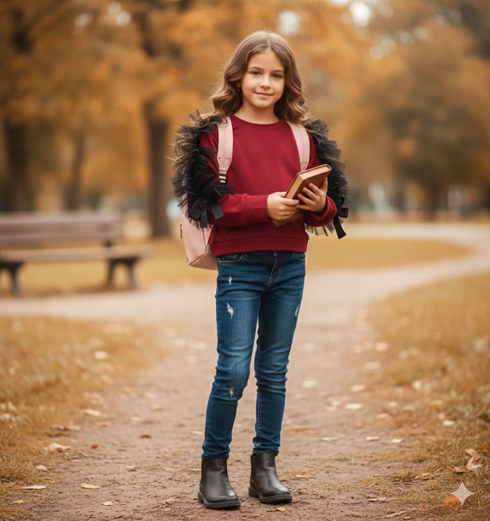 Dievčenská štýlová mikina s vreckom, na spodku je gumička. Od krku ku koncu rukáva ju lemuje tyl, zakončený mašličkou.