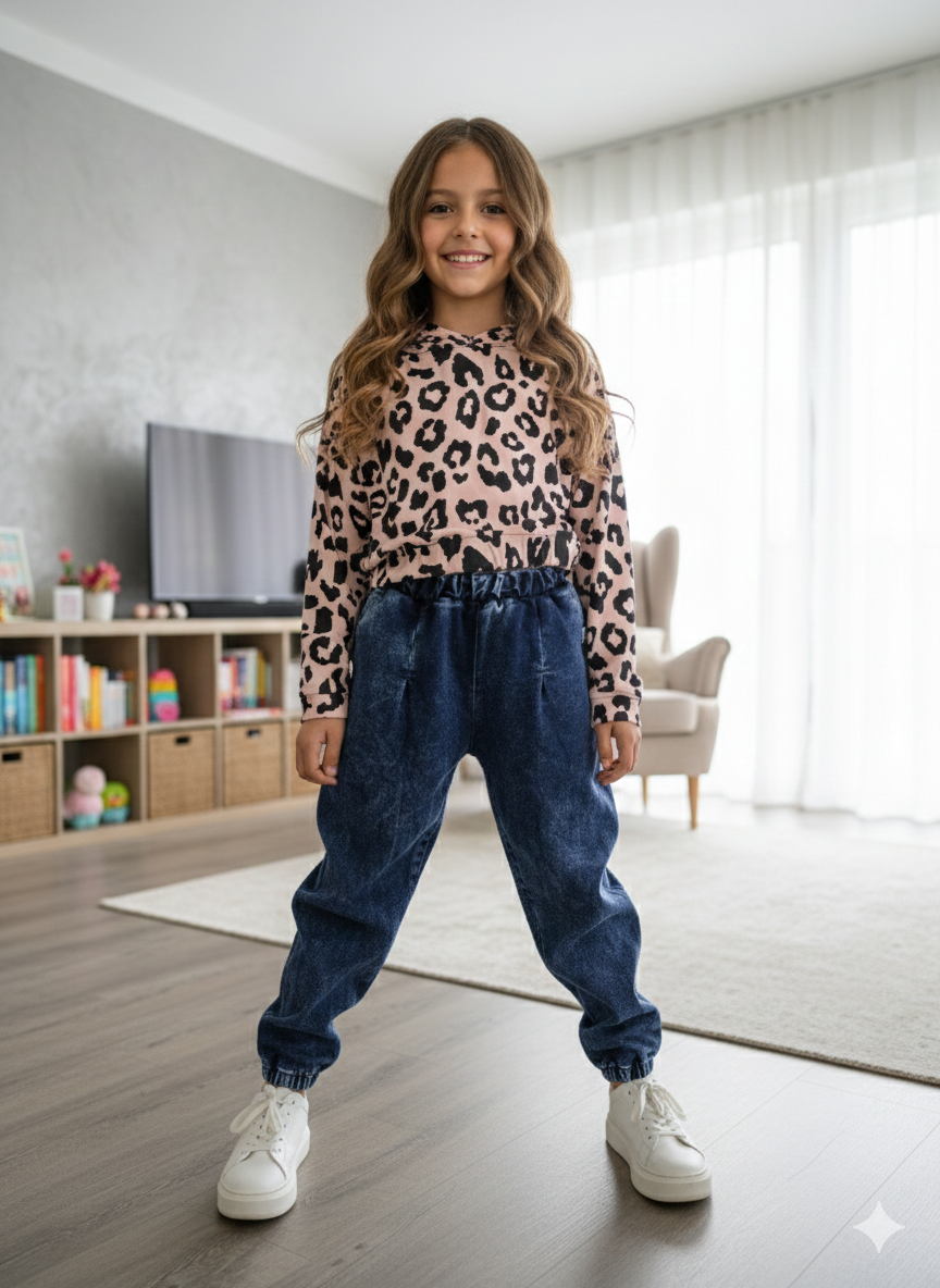 Dievčenské pohodlné rifle majú balónový strih, vrecká, na spodku gumku, na zadku vrecko.