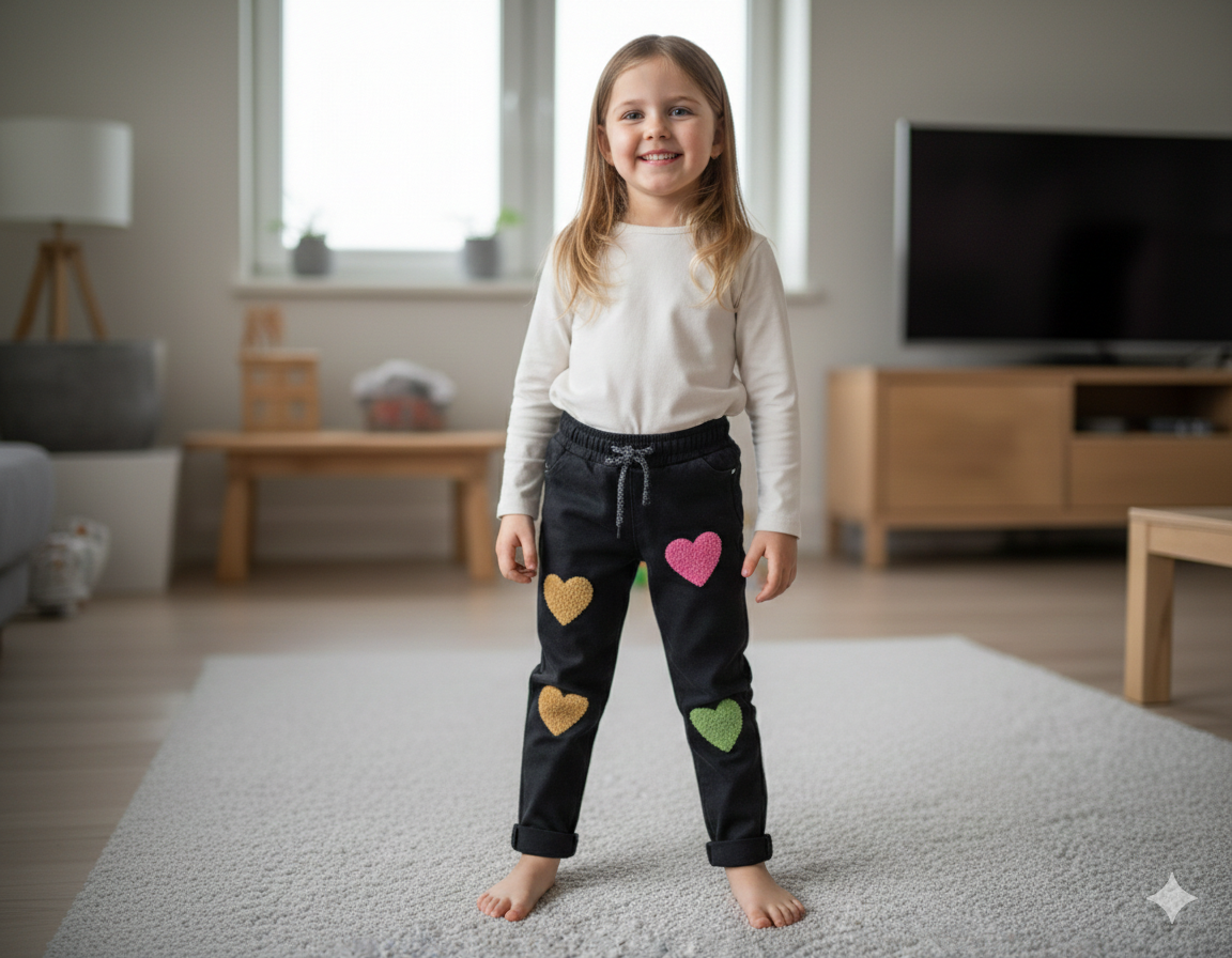 Dievčenské elastické nohavice Champion majú gumu v páse, bočné vrecká, ozdobná mašlička na páse. Nohavice sú v čiernej farbe s farebnými srdiečkami.