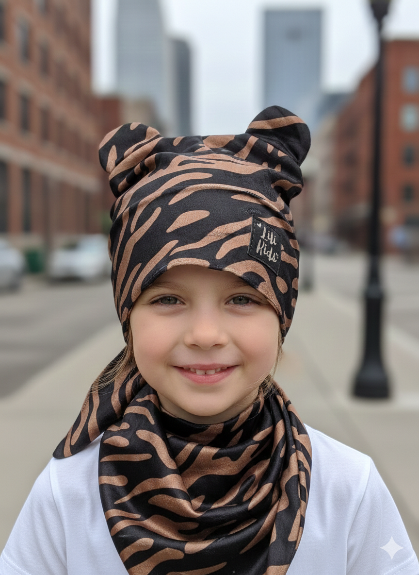 Dievčenský velúrový set čiapka s uškami so šatkou s tigrovaným a zebrovaným vzorom.